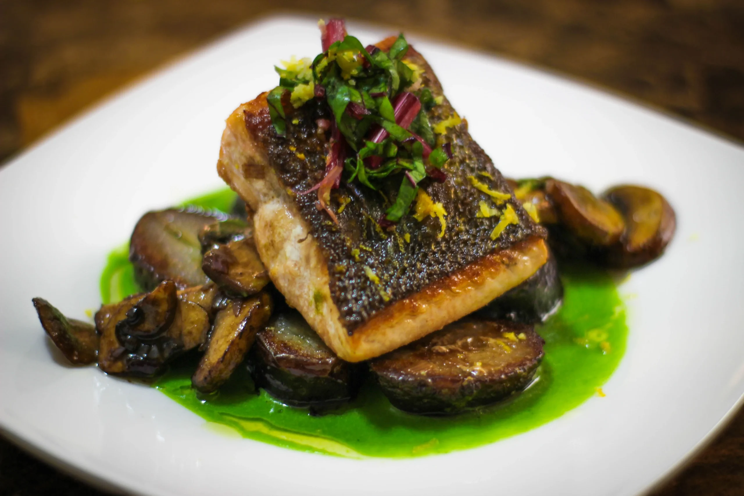 Salmon Tail with Peas and Wild Mushrooms